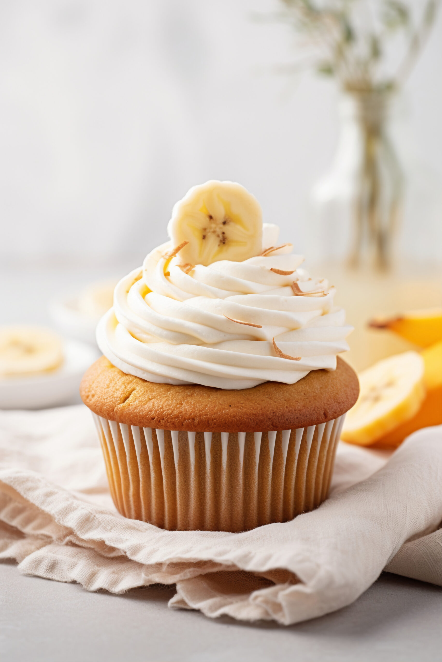Fluffy banana cupcake topped with a silky swirl of vanilla cream and a fresh banana slice — simple, pure, and totally irresistible.